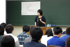 5日は,学科の先生方の自己紹介からスタート。最初は,山口学科長,次に,総合情報学部長でもある志野先生。以後,「ナビゲーションブック」の順に先生方が,担当授業紹介と学生生活で心がけてほしいことなどを熱く語りました。